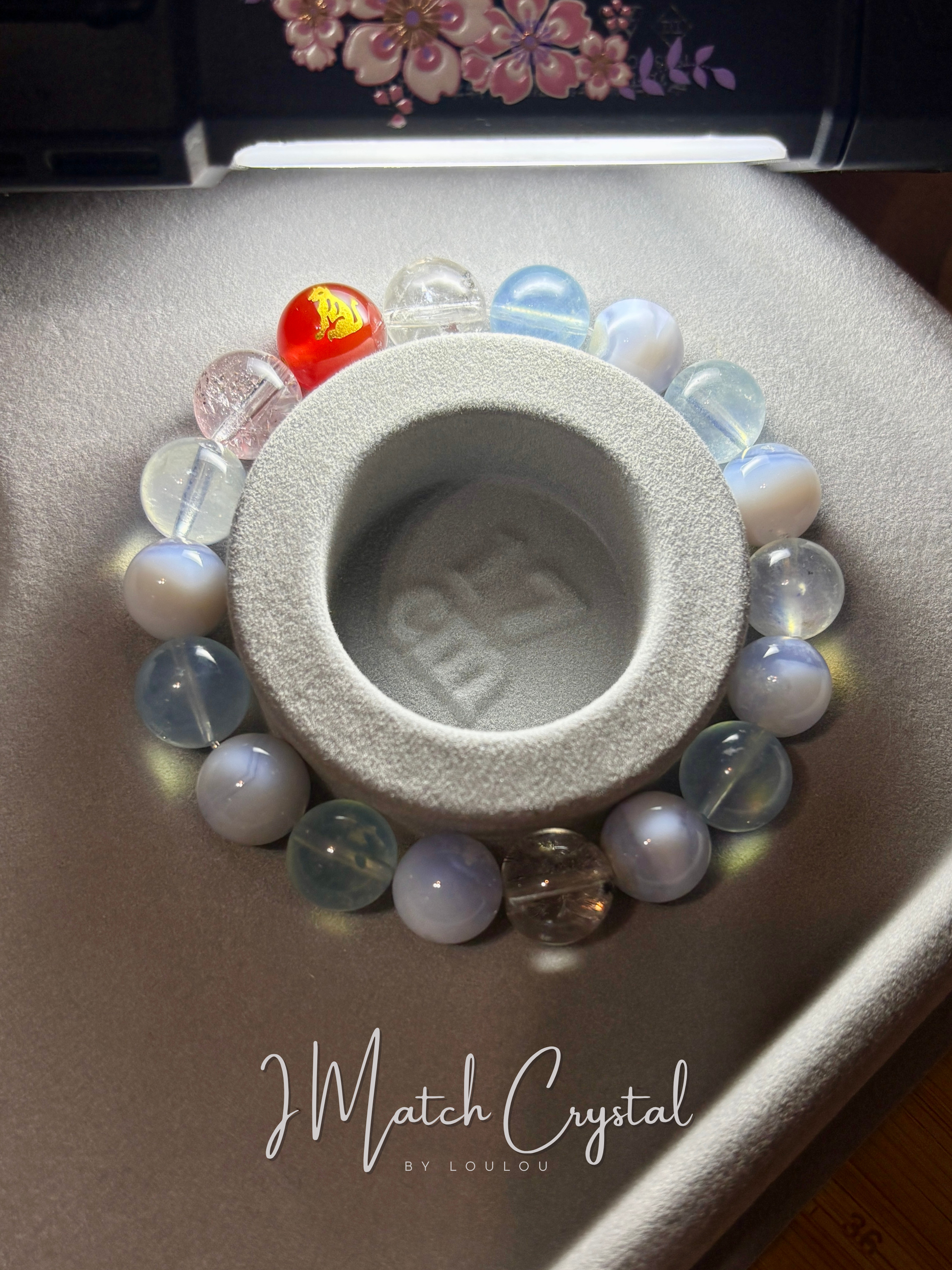 專屬設計:依生肖「六合貴人」原理,為屬兔者(六合:狗)量身定制,匯聚海藍寶的靈動、藍紋瑪瑙的沉穩與白閃靈鑽的淨化力,搭配「紅瑪瑙狗珠」激活命理貴人緣,助運勢亨通。