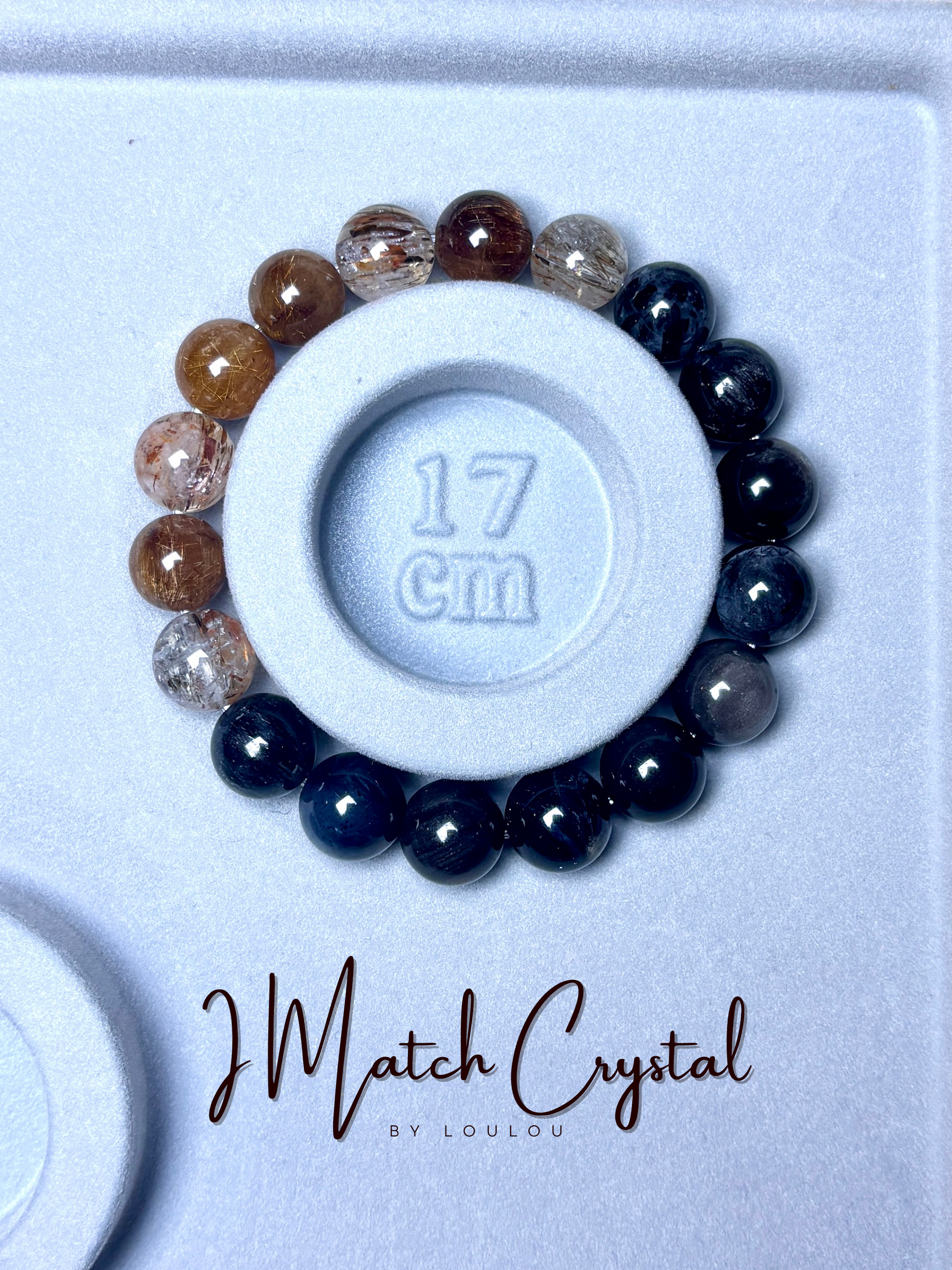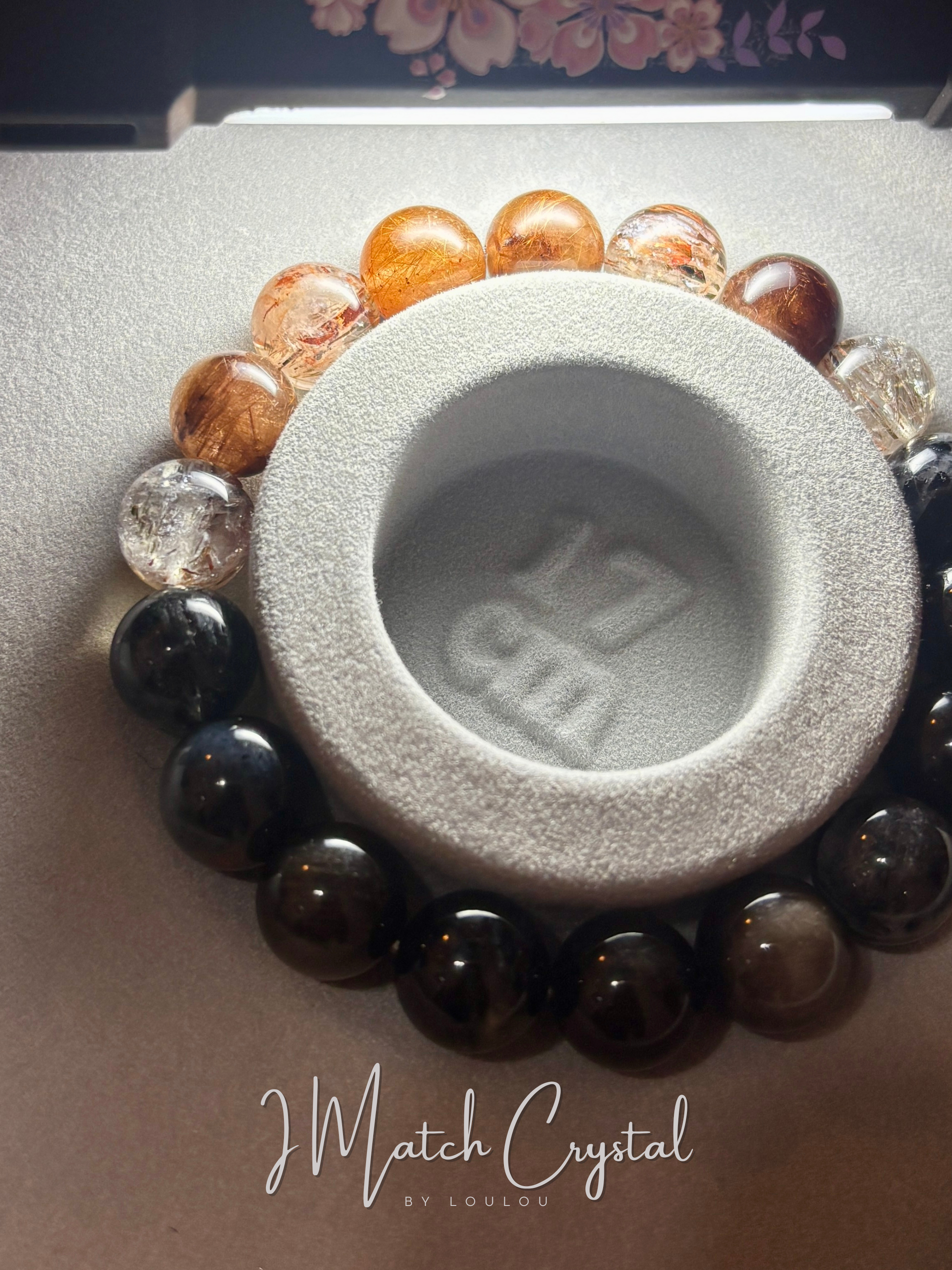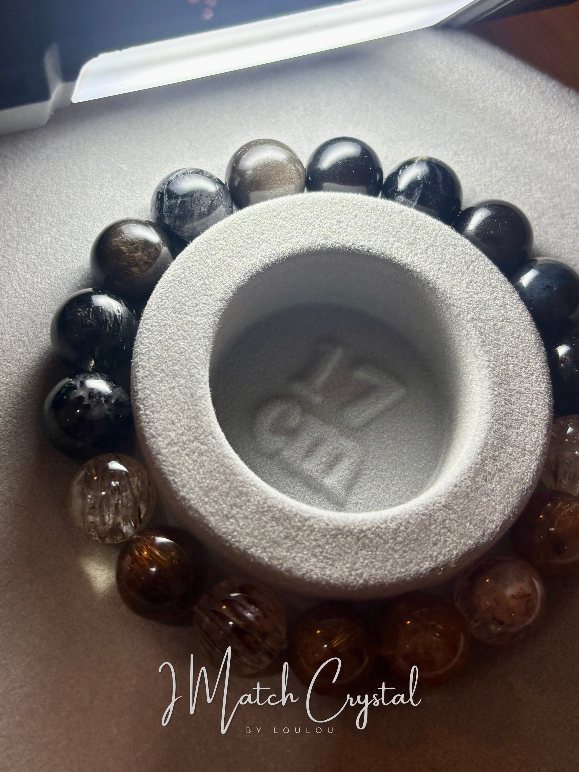 這條手串專為 農曆七月(盂蘭節) 及 經常進出醫院、殯儀行業人士 設計,嚴選 黑金超七(碧璽髮晶)、黑髮晶、紅銅髮晶、銀曜石 四種高能量水晶,以11mm圓珠 精密串制,打造 「防煞+招貴+穩氣場」三重防護,助您平安渡過陰性能量高峰期,並在特殊職業環境中保持身心平衡。